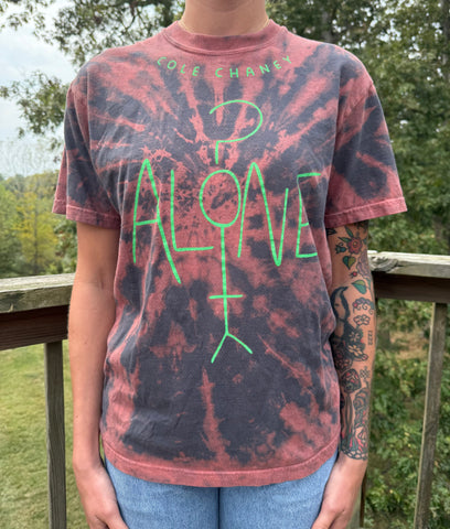"Comfort Colors" brand heavyweight, 100% cotton, short sleeved tshirt. These shirts were misprints that we salvaged by using reverse tie dye to create a one-of-a-kind design. Green screen print. Allow for variation in design. Color varies slightly from photo. Also allow for extra delivery time related to creating/processing your one of a kind shirt. VERY IMPORTANT: do not wash your new shirt with other laundry for first couple of washes because IT WILL BLEED. the process to create these shirts requires bleach, so expect some residual bleach in the first couple COLD WATER washes. After that, you're good to go!