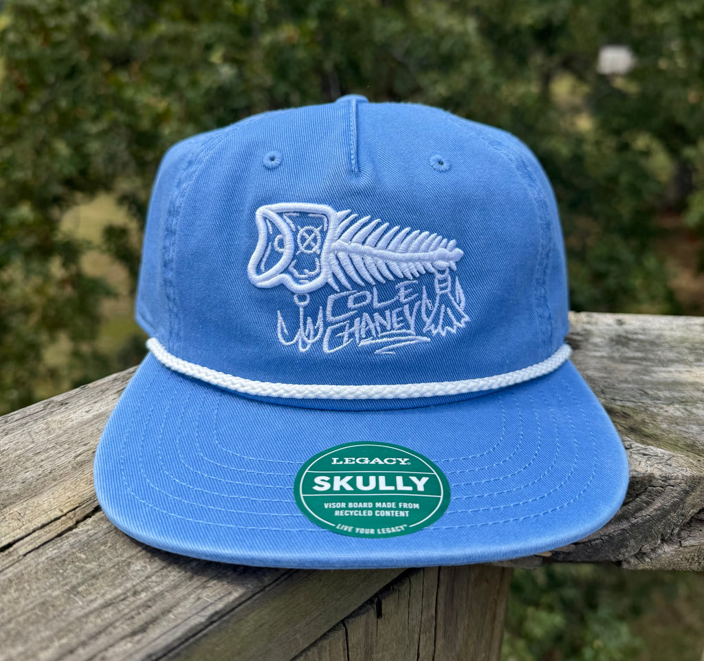 Soft, flexible, durable "Legacy" brand skully cap. Rope front, embroidered, snapback.